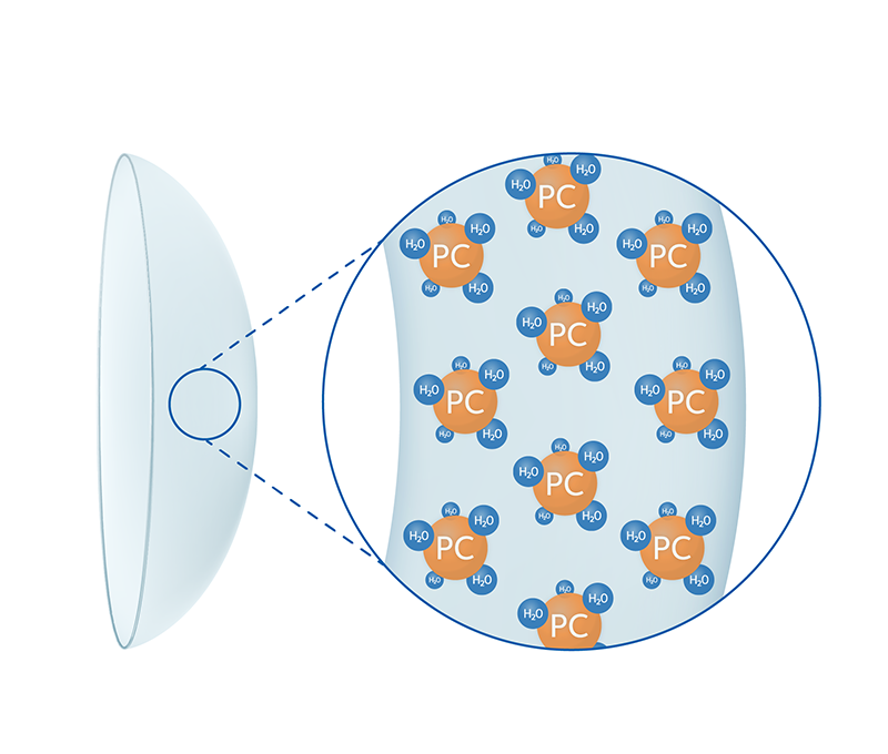 Så här fungerar PC Technology™: Molekyler av fosforylkolin (PC) är naturligt hydrofila. De attraherar vattenmolekylerna i tårarna och binder dem till kontaktlinsernas yta. Detta skapar en ”sköld” av vatten runt linserna som håller dem rena och motverkar att linserna torkar ut, vilket gör att de känns fuktiga och bekväma hela dagen.