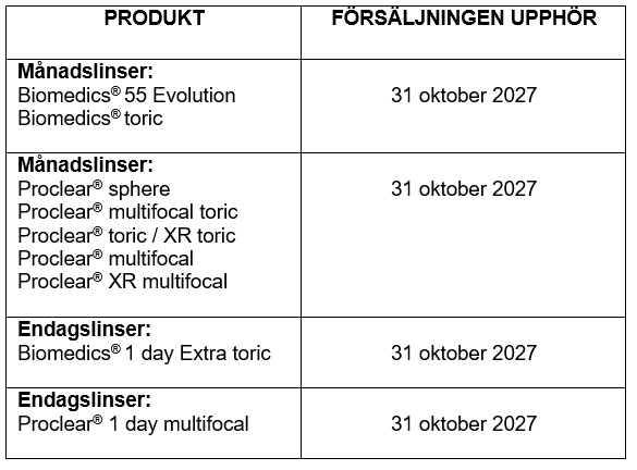 Övergången kommer att ske under de kommande två åren och innebär att företaget fasar ut vissa Biomedics®- och Proclear®-hydrogelprodukter: